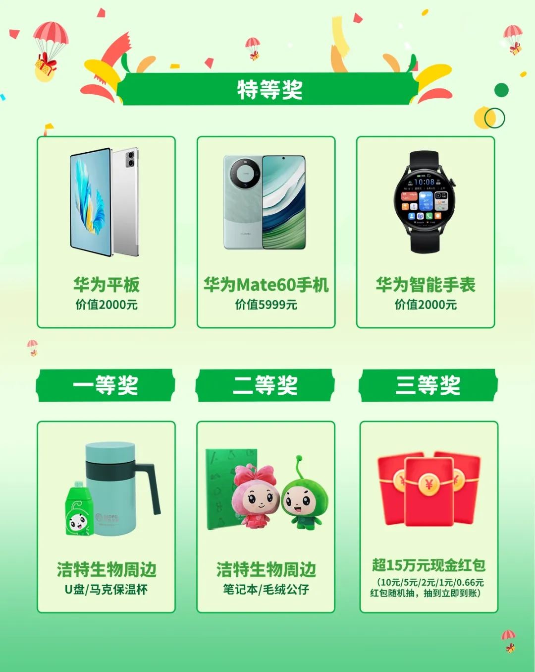 購(gòu)買潔特生物細(xì)胞培養(yǎng)板、細(xì)胞培養(yǎng)瓶,開(kāi)箱就能掃碼抽獎(jiǎng)!每箱活動(dòng)產(chǎn)品含有1~4個(gè)抽獎(jiǎng)二維碼,如果您購(gòu)買了一箱活動(dòng)產(chǎn)品,您將獲得最多4次抽獎(jiǎng)機(jī)會(huì)哦!中獎(jiǎng)率高達(dá)90%以上!可以瓜分15萬(wàn)元紅包池,更有華為Mate60手機(jī)/平板/手表、潔特生物周邊等你抱回家!